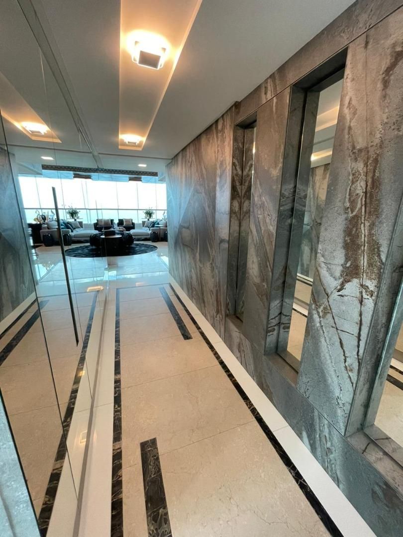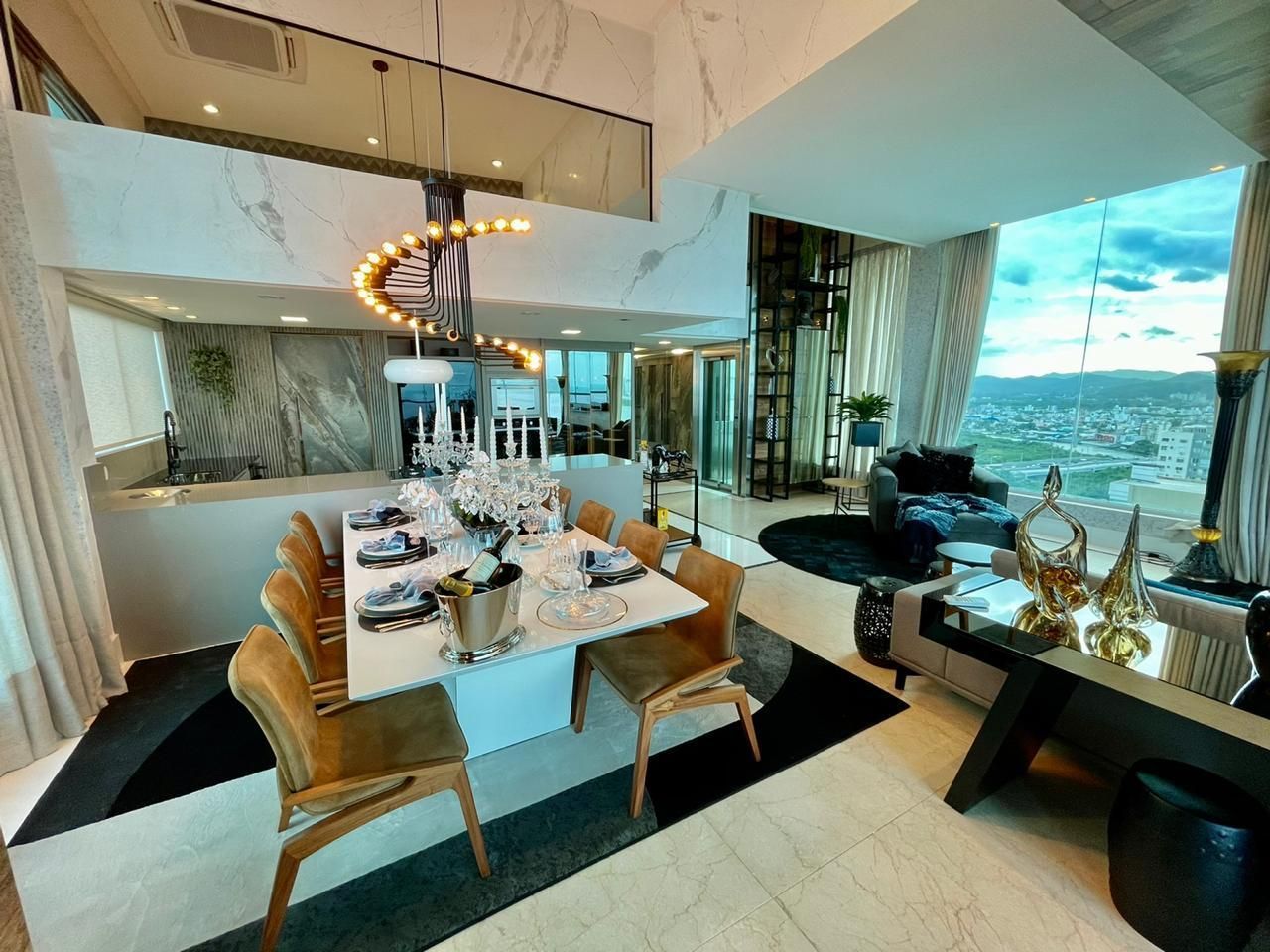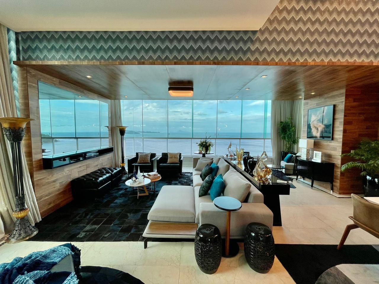 - Sala com pé direito alto, paredes laterais de vidro duplos laminado e temperado